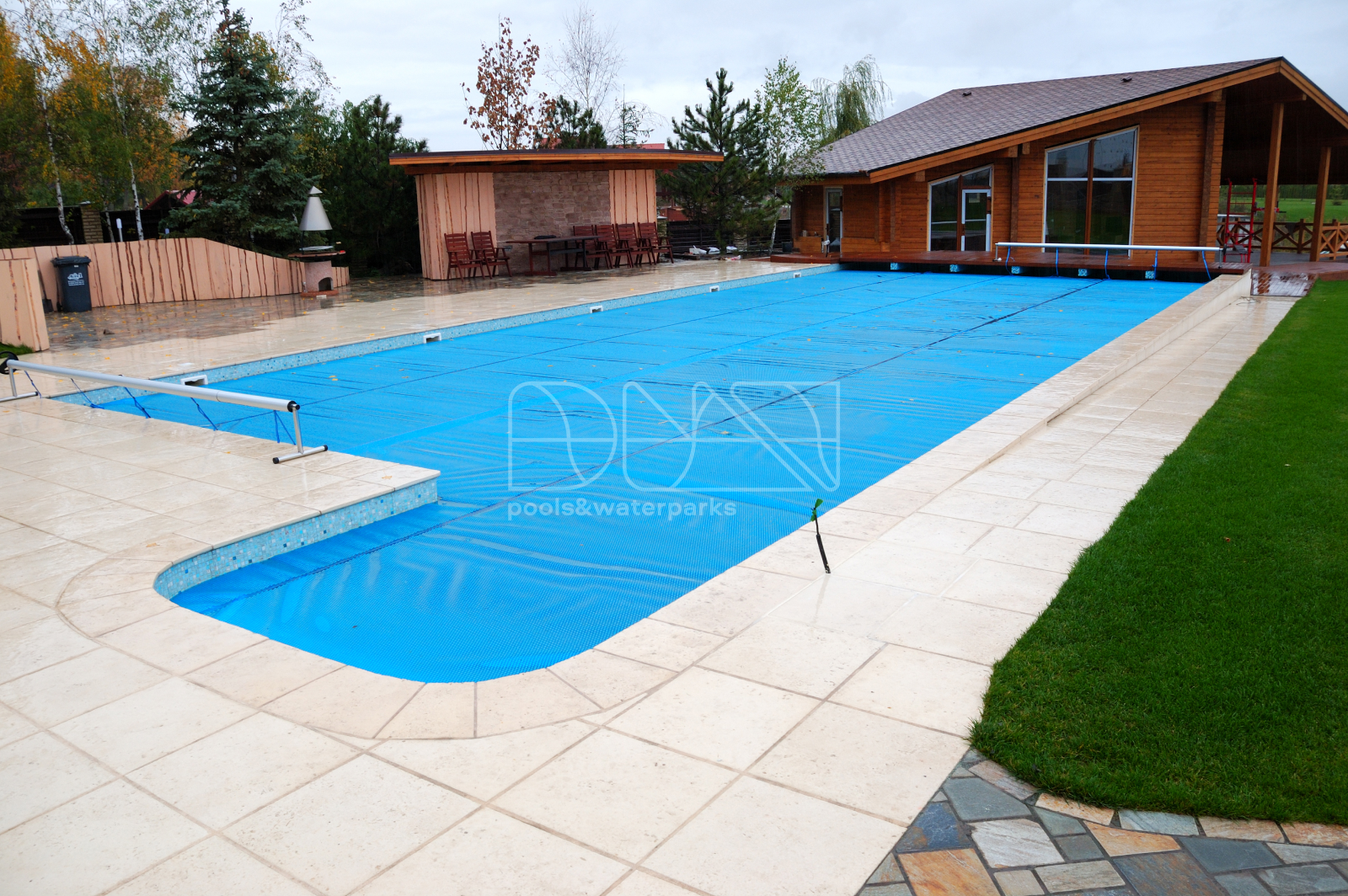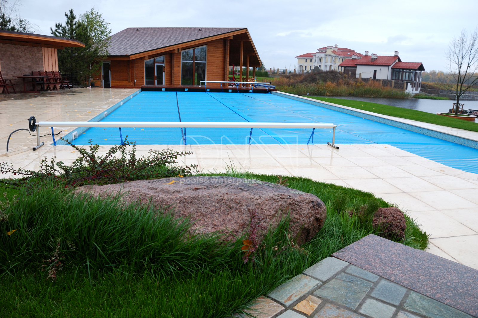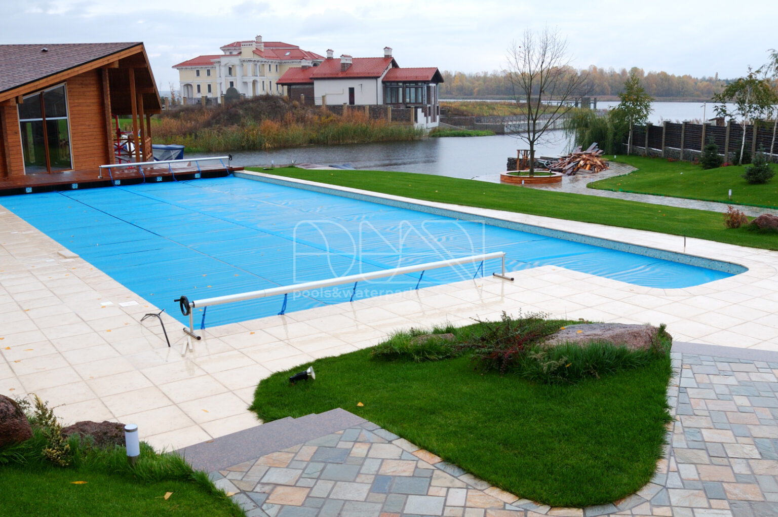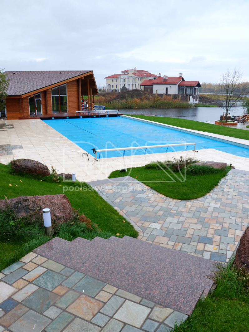 Открытый бассейн в загородном доме на берегу залива Днепра – это не просто элемент роскоши, это символ продуманного комфорта и гармонии с природой. Скиммерный тип бассейна с подводным освещением и отделкой стекломозаикой идеально вписывается в ландшафтный дизайн участка, создавая естественное продолжение пространства. Солярное накрытие бассейна не только сохраняет тепло воды, но и подчеркивает экологичный подход владельцев дома.