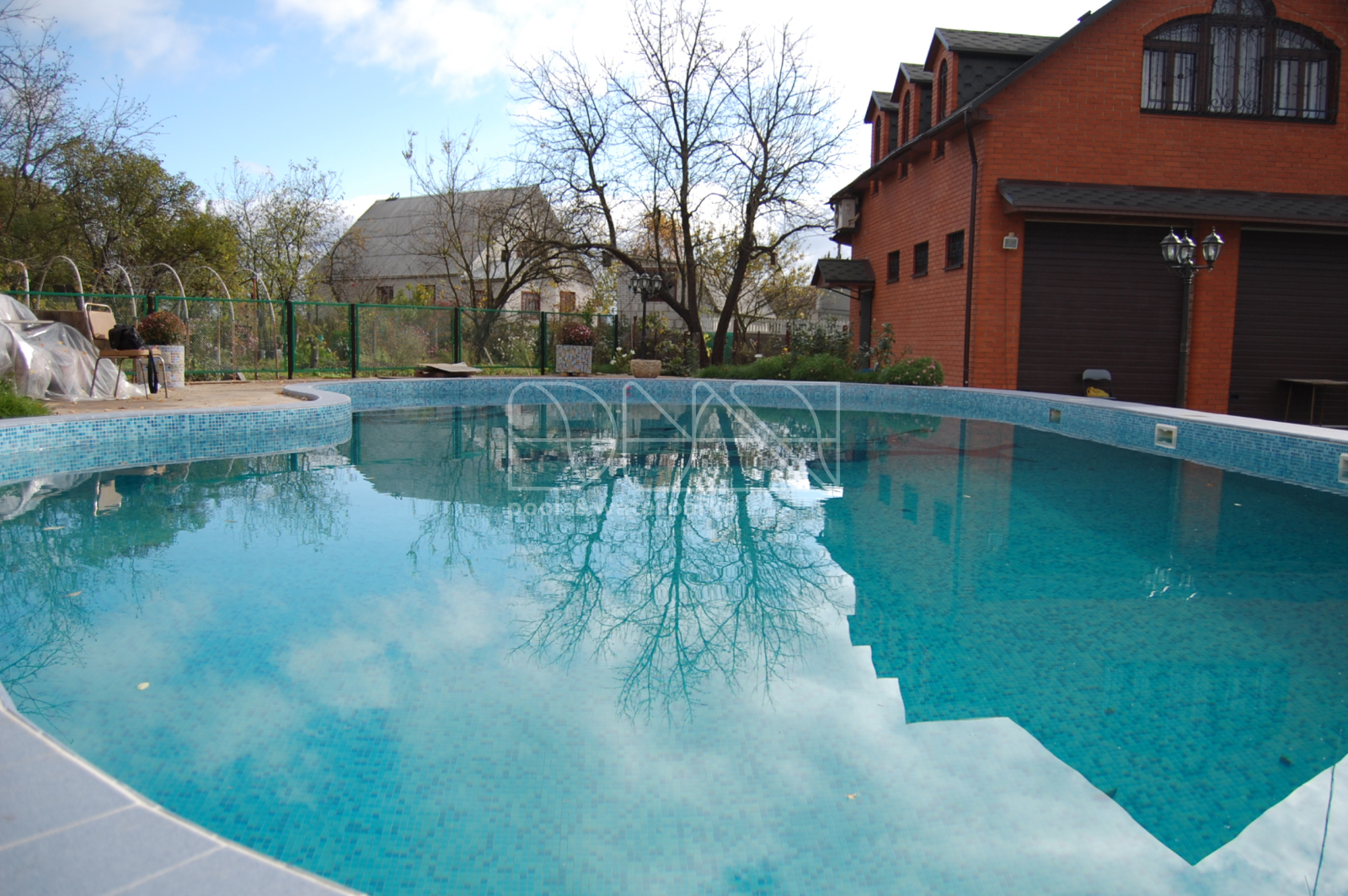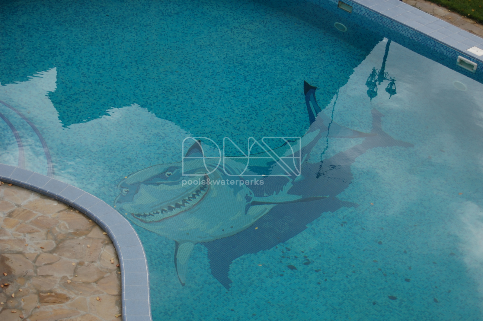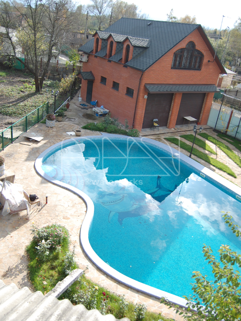 Представляем вашему вниманию эксклюзивный проект бассейна, который стал украшением частного домовладения. Скиммерный бассейн не только выделяется интересной геометрической формой, но и привлекает взгляды уникальной отделкой чаши стекломозаикой с реалистичным узором в виде акулы. Такой дизайн создает иллюзию настоящего морского пространства прямо в вашем дворе. Площадь бассейна составляет 125 м2, а объем воды — впечатляющие 180 м3.